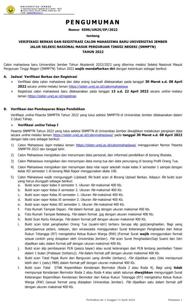 Verifikasi Berkas dan Registrasi Calon Mahasiswa Baru Jalur SNMPTN Tahun 2022