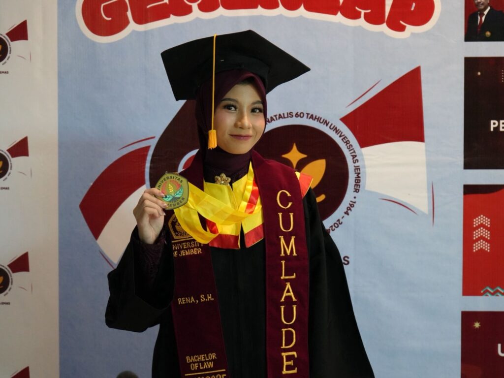 Kisah ini datang dari Rena, seorang mahasiswi Fakultas Hukum Universitas Jember yang inspiratif. Perjalanan akademiknya adalah cerminan dedikasi, strategi, dan yang paling utama adalah dukungan dari sebuah keluarga yang ikut berjuang.Rena berhasil menorehkan prestasi yang memukau dengan mempertahankan IPK 3,8 dan menyelesaikan studinya hanya dalam kurun waktu 3 tahun 6 bulan. Prestasi ini nyatanya juga dihiasi dengan berbagai penghargaan. Ia pernah menjadi finalis lomba esai PENA EMAS 2022 yang diselenggarakan oleh Universitas Trunojoyo, serta meraih gelar ‘Best Essay’ dalam kompetisi September Bulan Membaca (SBM) 2022 yang diadakan oleh UIN Sayyid Ali Rahmatullah Tulungagung. Tak hanya itu, minat Rena dalam dunia riset juga terlihat jelas melalui 3 publikasi jurnal yang telah ia lakukan dan salah satunya bahkan berhasil terakreditasi Sinta 4.