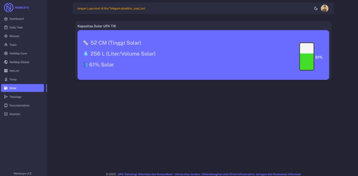 Inovasi ini dikembangkan oleh tim Divisi Infrastruktur Jaringan dan Keamanan Informasi UPA TIK sebagai solusi cerdas untuk mencegah server padam akibat keterlambatan pengisian bahan bakar, sekaligus mendukung efisiensi kerja dan keamanan infrastruktur teknologi kampus. “Selama ini, setiap kali ada pemadaman, petugas teknisi maupun satpam harus berjalan ke lokasi genset untuk mengecek langsung tangki solar. Kadang dilakukan berkali-kali, terutama kalau libur panjang atau malam hari. Dari situ muncul ide, bagaimana kalau dibuat alat seperti indikator bahan bakar di mobil, yang bisa memberi tahu berapa persen solar yang tersisa,” ungkap Rochmad Haryanto, Wakil Koordinator Kelompok Kerja Tata Usaha UPA TIK UNEJ.