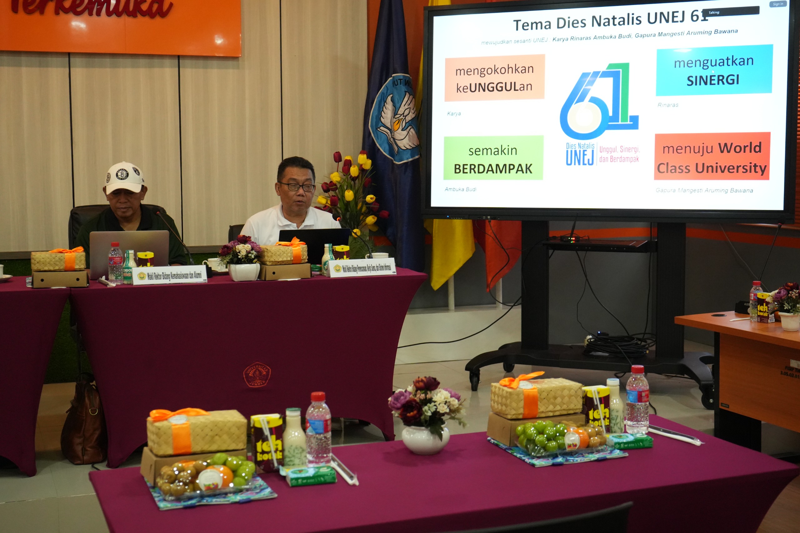 Rangkaian kegiatan dalam rangka peringatan Dies Natalis Universitas Jember (UNEJ) ke 61 dimulai ! Ditandai dengan peluncuran logo dan tema dies natalis oleh Rektor bersama Ketua Senat UNEJ pada saat kegiatan Harmoni Pagi di kampus FISIP (17/10/2025). Tema Dies Natalis UNEJ ke 61 adalah Unggul, Sinergi dan Berdampak. Turut mendampingi Rektor dan Ketua Senat meluncurkan logo dan tema dies natalis, seluruh wakil rektor serta Dekan FISIP.