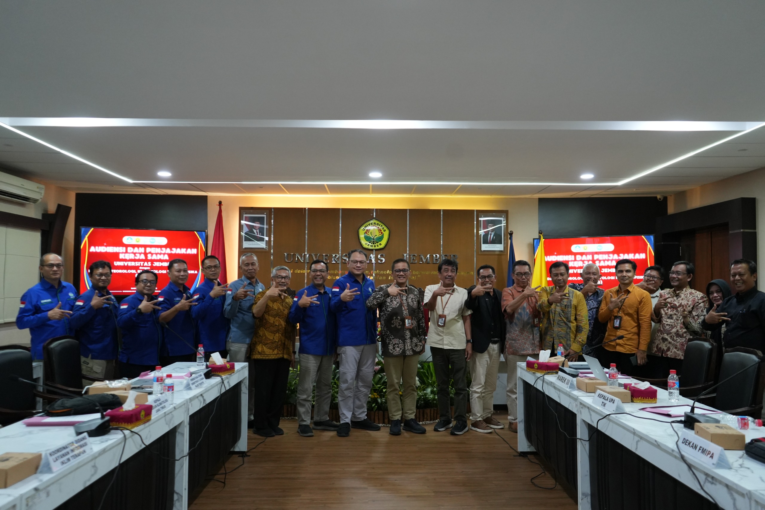 Dalam pertemuan ini Deputi Bidang Klimatologi BMKG didampingi para pejabat etras BMKG pusat dan Jawa Timur diantaranya Direktur Layanan Iklim Terapan, Direktur Perubahan Iklim, hingga Kepala Stasiun Klimatologi Jawa Timur. Sementara Rektor UNEJ didampingi para wakil Rektor, Dekan FMIPA, Dekan Fasilkom, Dekan Fakultas Teknik, Wakil Dekan III Fakultas Pertanian, Wakil Dekan III Fakultas Teknologi Pertanian, Kepala UPA TIK dan pejabat lainnya. (iim)