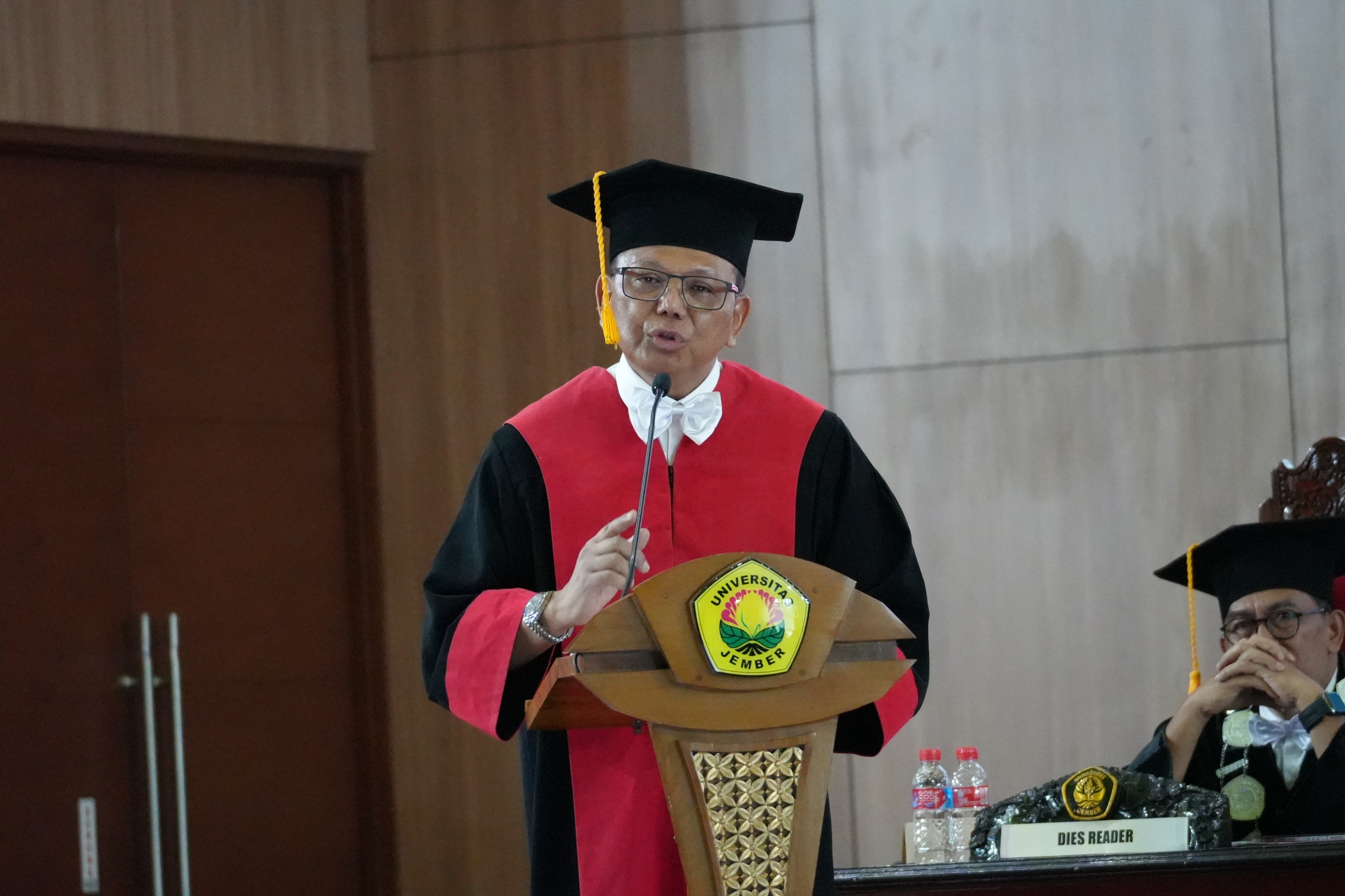 Ia lalu menambahkan, perguruan tinggi hari ini menghadapi tantangan percepatan digitalisasi, perkembangan teknologi kecerdasan buatan, serta dinamika hukum dalam sektor ekonomi dan tata kelola publik. FH UNEJ, menurutnya, harus terus memperkuat mutu tridharma, meningkatkan kualitas tata kelola berbasis digital, serta membuka ruang internasionalisasi menuju target besar 2035 sebagai World Class Law School.
