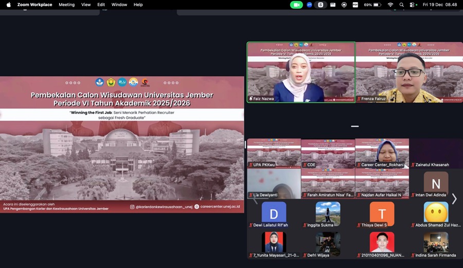 Komitmen tersebut diwujudkan melalui kegiatan Pembekalan Calon Wisudawan Universitas Jember Periode VI Tahun Akademik 2025/2026 dengan tema “Winning the First Job: Seni Menarik Perhatian Recruiter sebagai Fresh Graduate” yang diselenggarakan secara daring melalui Zoom Meeting pada Jum’at (19/12/2025).Kegiatan ini diikuti oleh ratusan calon wisudawan dari berbagai fakultas di lingkungan Universitas Jember. Pembekalan ini dirancang sebagai ruang belajar aplikatif bagi calon lulusan agar memiliki kesiapan mental, keterampilan, dan strategi dalam menghadapi proses rekrutmen kerja yang semakin kompetitif.