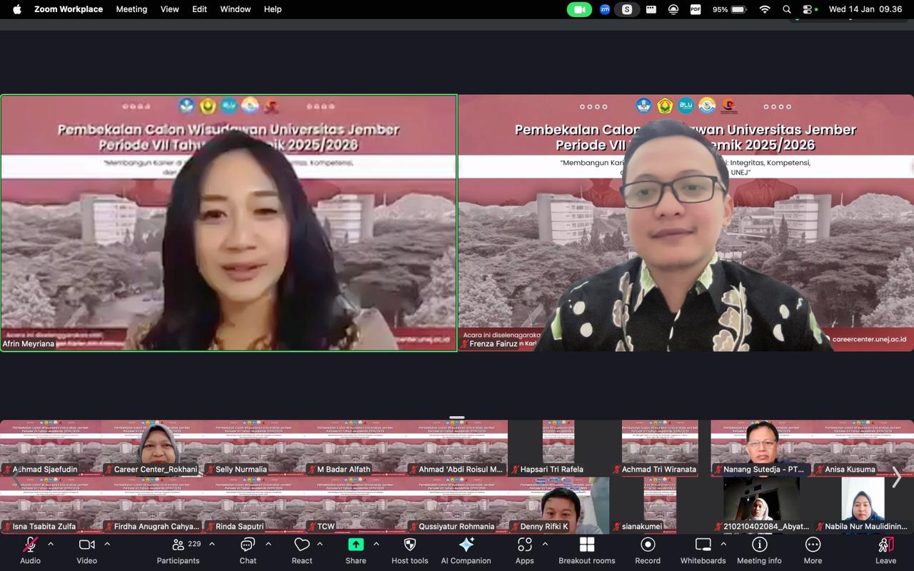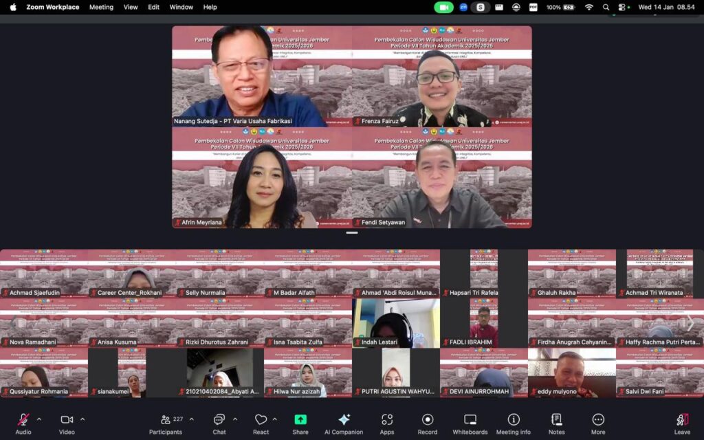 Komitmen tersebut diwujudkan melalui kegiatan Pembekalan Calon Wisudawan Universitas Jember Periode VII Tahun Akademik 2025/2026 yang diselenggarakan secara daring oleh UPA Pengembangan Karier dan Kewirausahaan Universitas Jember bekerja sama dengan Keluarga Alumni Universitas Jember (KAUJE), Rabu (14/1).Mengusung tema “Membangun Karier di Era Media dan Informasi: Integritas, Kompetensi, dan Personal Branding Lulusan UNEJ”, kegiatan ini diikuti oleh ratusan calon wisudawan dari berbagai fakultas di lingkungan Universitas Jember yang dimoderatori oleh Dr. Frenza Fairuz Firmansyah, S.Pd., M.Pd.. Pembekalan ini dirancang untuk ruang strategis bagi calon lulusan untuk memahami dinamika dunia kerja yang semakin kompetitif, terbuka, dan dipengaruhi oleh perkembangan teknologi serta media digital.