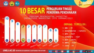 “Alhamdulillah, ada tujuh Ormawa di Universitas Jember yang mendapatkan pendanaan dari Direktorat Pembelajaran dan Kemahasiswaan Ditjen Dikti. Mereka adalah Himpunan Mahasiswa Elektro Fakultas Teknik, IAAS Program Studi Perencanaan Wilayah dan Kota Fakultas Teknik. Himpunan Mahasiswa Program Studi Peternakan Fakultas Pertanian, BPM Fakultas Keperawatan, GEMAPITA FKIP, BEM FMIPA, serta HMPS Pendidikan IPA FKIP,” jelas Prof. Slamin. Sebagai informasi peringkat pertama perguruan tinggi yang paling banyak menerima dana PPK Ormawa 2022 adalah Institut Pertanian Bogor yang meloloskan 10 Ormawa, Universitas Diponegoro (9 Ormawa), Universitas Gadjah Mada (8 Ormawa), Universitas Jember (7 Ormawa) dan Universitas Negeri Sebelas Maret (7 Ormawa).