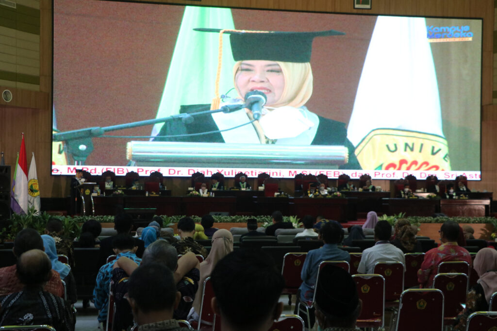 Pidato ilmiah pertama dibawakan oleh Prof. Dr. Akhmad Haryono, M.Pd., yang berjudul “Keragaman Bahasa dan Budaya : Peranan dan Problematikanya Dalam Komunikasi Antar Budaya”. Dalam paparannya, Prof. Akhmad Haryono mengingatkan bahwa Indonesia adalah negara plural yang terdiri dari berbagai etnik, agama, bahasa dan budaya. Keunikan tradisi dan budaya masyarakat suatu etnik berdampak pada terbentuknya keunikan bahasa yang digunakan dalam berkomunikasi. Penguasaan terhadap suatu bahasa tidak mutlak menjamin mulusnya hubungan komunikasi antara manusia yang satu dengan yang lainnya.