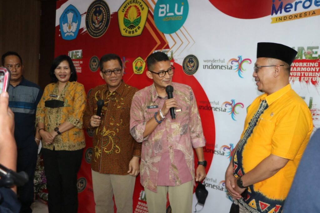Menteri Pariwisata dan Ekonomi Kreatif Dr. H. Sandiaga Salahuddin Uno, B.B.A, M.B.A. berkesempatan memberikan kuliah umum kepada seluruh sivitas akademika Universitas Jember yang hadir di Auditorium Universitas Jember, Minggu, 7 Agustus 2022. Dalam acara kuliahan umum yang diselenggarakan secara luring tersebut, Sandiaga Uno menyampaikan materi dengan tema “Digitalisasi Potensi Pariwisata dan Ekonomi Kreatif”. Acara kuliah umum dibuka oleh Rektor Universitas Jember Dr. Iwan Taruna.