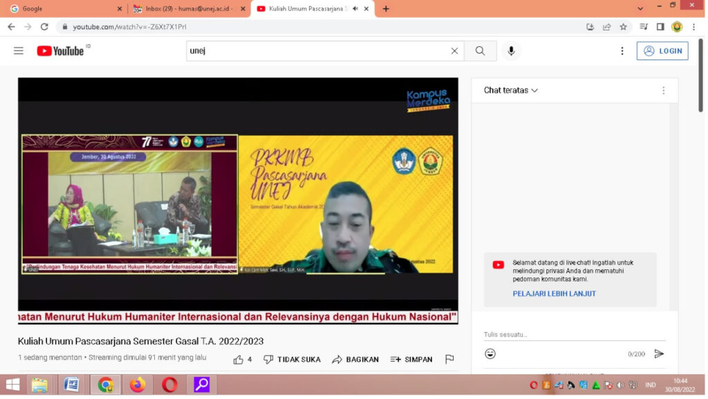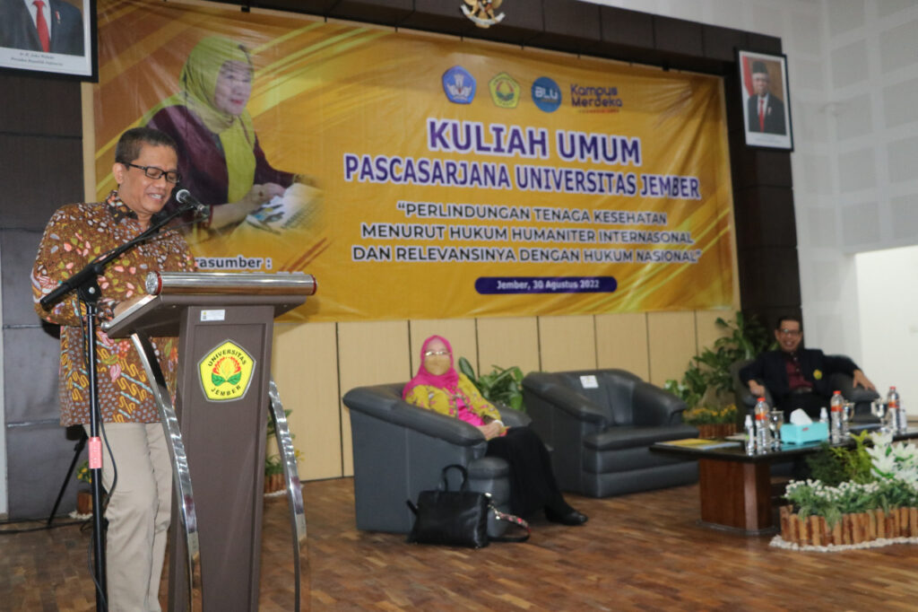 Kegiatan kuliah umum dilakukan secara hibrida dengan cara pemateri dan 60 peserta berada di aula lantai 5 gedung R. Soedjarwo, sementara 200 peserta lainnya mengikuti secara daring. Dalam laporannya, Direktur Pascasarjana Universitas Jember, Prof. M. Arief Amrullah menjelaskan jika peserta kegiatan kuliah umum adalah mahasiswa baru Pascasarjana angkatan 2022. Kegiatan kuliah umum digelar secara teratur dengan menghadirkan pemateri dan tema yang relevan dengan situasi dan kondisi saat ini. “Tema perlindungan tenaga kesehatan dalam kerangka Hukum Humaniter Internasional dipilih karena masih belum banyak dibahas dan relevan dengan kondisi dunia dimana ada perang antara Rusia-Ukraina,” tutur guru besar Fakultas Hukum di bidang pidana ini.