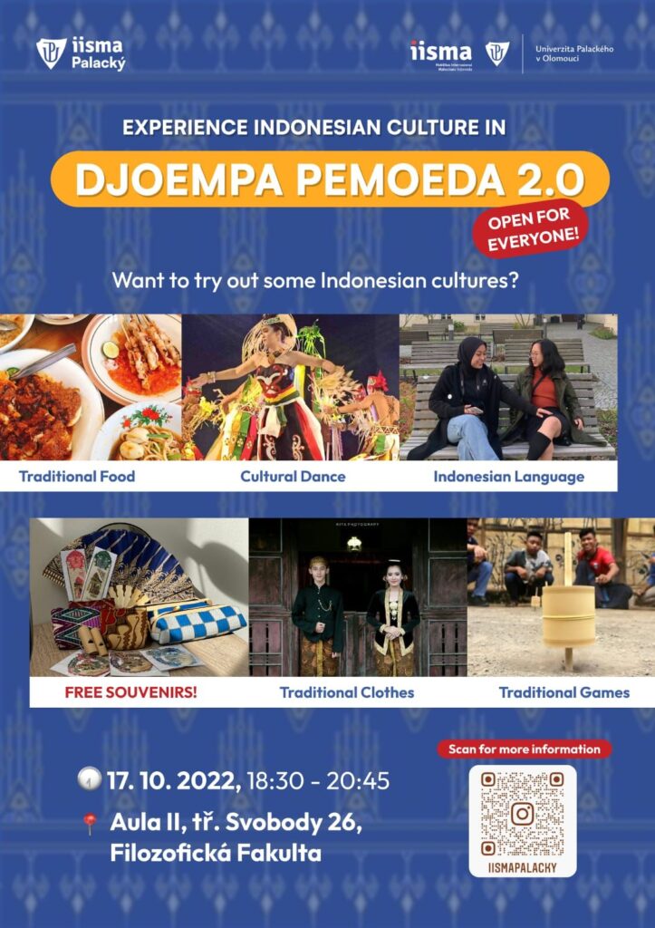 Djoempa Pemoeda 2.0. dibuka dengan suguhan minuman selamat datang dan oleh-oleh tradisional Indonesia kepada para pengunjung. Dilanjutkan dengan rangkaian beragam acara yang mencerminkan dan mempromosikan Indonesia, seperti presentasi budaya Indonesia yang bertajuk “A Glimpse of Indonesia”. Diantara unjuk kebolehan adalah pertunjukan lagu nasional dan tradisional yang dibawakan oleh rekan-rekan, ada lagu Tanah Airku dan Manuk Dadali. Kami juga berkesempatan untuk mempertontonkan salah satu tarian daerah Indonesia, yaitu tari Balean Dadas, di panggung internasional di kampus Palacky University Olomouc.
