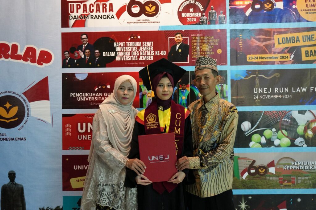 Kisah ini datang dari Rena, seorang mahasiswi Fakultas Hukum Universitas Jember yang inspiratif. Perjalanan akademiknya adalah cerminan dedikasi, strategi, dan yang paling utama adalah dukungan dari sebuah keluarga yang ikut berjuang.Rena berhasil menorehkan prestasi yang memukau dengan mempertahankan IPK 3,8 dan menyelesaikan studinya hanya dalam kurun waktu 3 tahun 6 bulan. Prestasi ini nyatanya juga dihiasi dengan berbagai penghargaan. Ia pernah menjadi finalis lomba esai PENA EMAS 2022 yang diselenggarakan oleh Universitas Trunojoyo, serta meraih gelar ‘Best Essay’ dalam kompetisi September Bulan Membaca (SBM) 2022 yang diadakan oleh UIN Sayyid Ali Rahmatullah Tulungagung. Tak hanya itu, minat Rena dalam dunia riset juga terlihat jelas melalui 3 publikasi jurnal yang telah ia lakukan dan salah satunya bahkan berhasil terakreditasi Sinta 4.