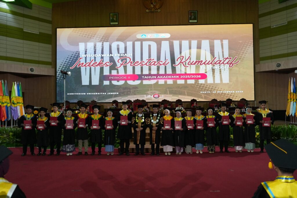 Universitas Jember (UNEJ) kembali menggelar upacara wisuda periode kedua tahun akademik 2025/2026 di Gedung Auditorium Kampus Tegalboto, Sabtu (20/09/2025).