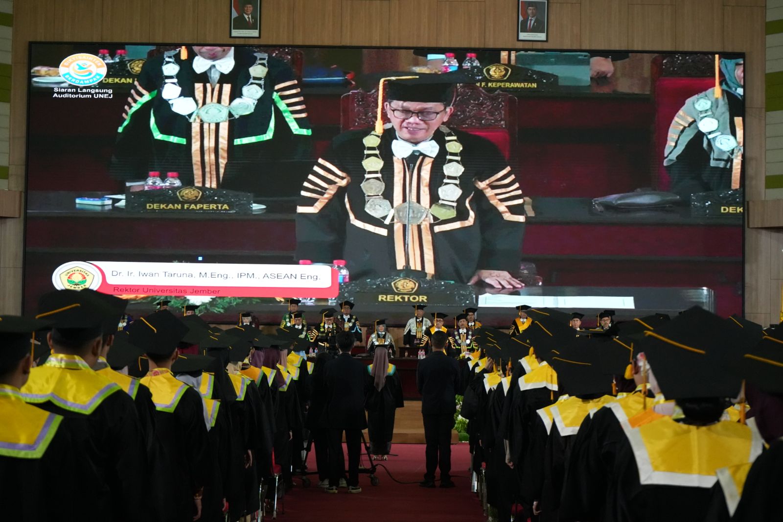 “Ingat, jangan mudah tergoda jalan pintas, sebab saya yakin yang akan bertahan adalah mereka yang jujur, disiplin dan peduli. Dan bukannya sekedar mereka yang paling cerdas. Krisis ekonomi jangan sampai mengguncang moral kita,” pesan Iwan Taruna kepada wisudawan UNEJ.
