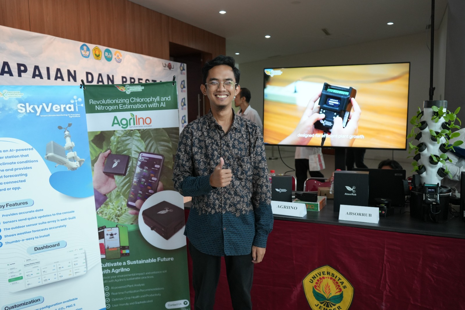 Inisiatif ini dikemas melalui pameran yang menampilkan total 12 produk, menyoroti riset solusi Smart Farm nyata hasil kolaborasi dengan Precision Agriculture Indonesia, sebuah perusahaan rintisan (start-up) yang didirikan oleh inventor internal UNEJ Prof. Bayu Taruna.