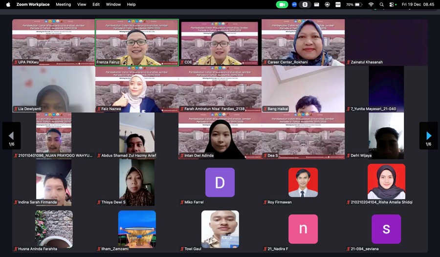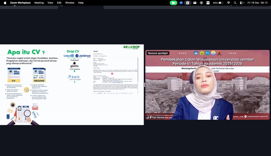 Komitmen tersebut diwujudkan melalui kegiatan Pembekalan Calon Wisudawan Universitas Jember Periode VI Tahun Akademik 2025/2026 dengan tema “Winning the First Job: Seni Menarik Perhatian Recruiter sebagai Fresh Graduate” yang diselenggarakan secara daring melalui Zoom Meeting pada Jum’at (19/12/2025).Kegiatan ini diikuti oleh ratusan calon wisudawan dari berbagai fakultas di lingkungan Universitas Jember. Pembekalan ini dirancang sebagai ruang belajar aplikatif bagi calon lulusan agar memiliki kesiapan mental, keterampilan, dan strategi dalam menghadapi proses rekrutmen kerja yang semakin kompetitif.