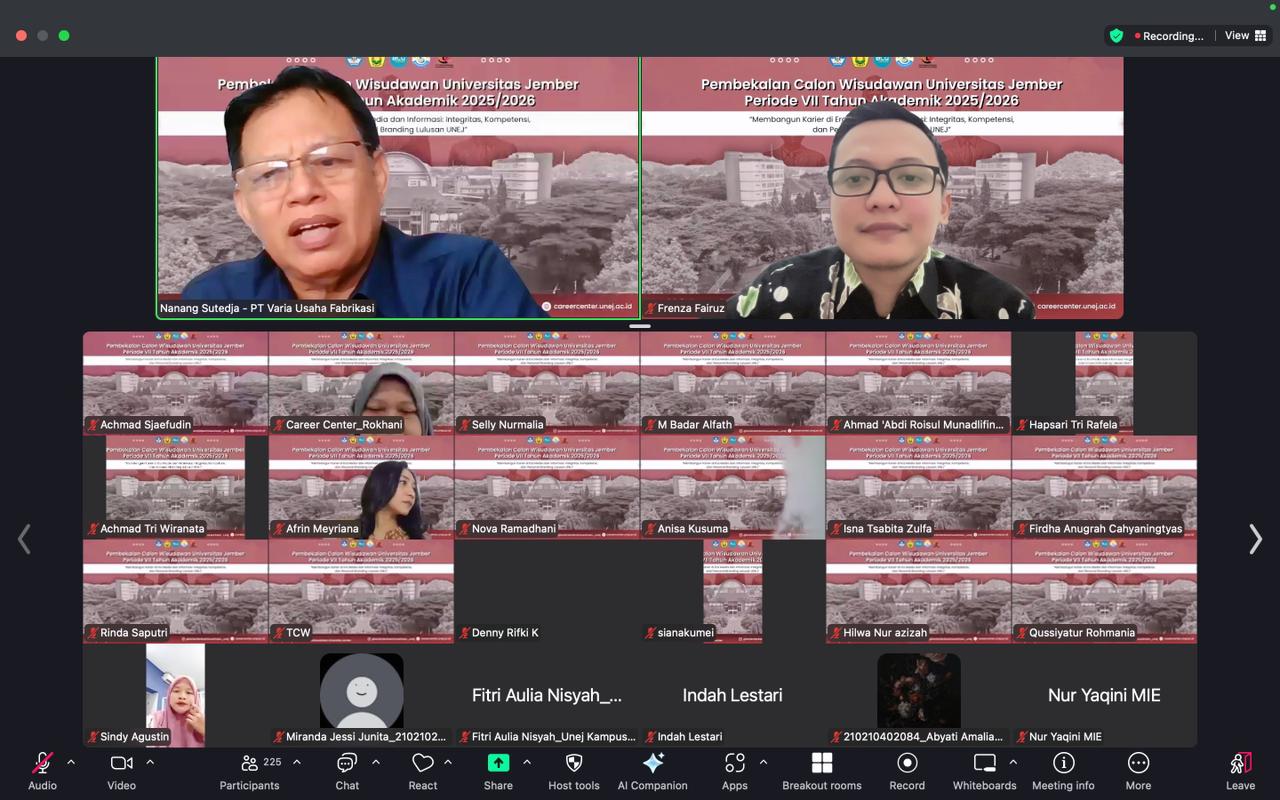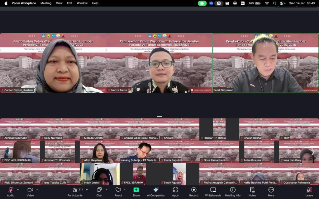 Komitmen tersebut diwujudkan melalui kegiatan Pembekalan Calon Wisudawan Universitas Jember Periode VII Tahun Akademik 2025/2026 yang diselenggarakan secara daring oleh UPA Pengembangan Karier dan Kewirausahaan Universitas Jember bekerja sama dengan Keluarga Alumni Universitas Jember (KAUJE), Rabu (14/1).Mengusung tema “Membangun Karier di Era Media dan Informasi: Integritas, Kompetensi, dan Personal Branding Lulusan UNEJ”, kegiatan ini diikuti oleh ratusan calon wisudawan dari berbagai fakultas di lingkungan Universitas Jember yang dimoderatori oleh Dr. Frenza Fairuz Firmansyah, S.Pd., M.Pd.. Pembekalan ini dirancang untuk ruang strategis bagi calon lulusan untuk memahami dinamika dunia kerja yang semakin kompetitif, terbuka, dan dipengaruhi oleh perkembangan teknologi serta media digital.