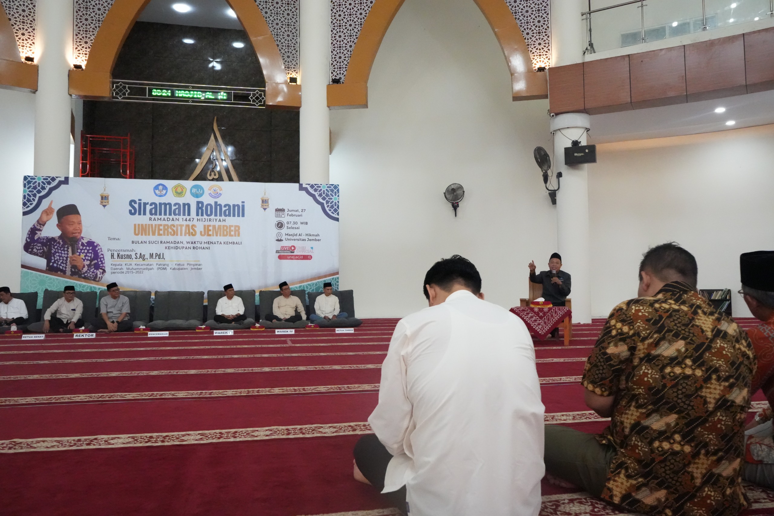 Dan puasa adalah salah satu sarana sebagai penyeimbang dunia dan akhirat. Maka ummat Islam yang menjalankan puasa dengan baik akan menjadi pribadi yang paripurna pula. Pesan ini disampaikan oleh Sekeretaris Pimpinan Daerah Muhammadiyah Jember, H. Kusno kala menjadi penceramah kegiatan siraman rohani keluarga besar Universitas Jember (UNEJ) di masjid Al Hikmah (27/2/2026).Menurut H. Kusno, manusia terdiri dari jasmani dan rohani, keduanya memerlukan asupan yang baik agar kehidupan manusia sukses di dunia dan selamat di akhirat. Mereka yang mengutamakan urusan dunia dan melupakan urusan akhirat tergolong orang yang merugi. Oleh karena itu puasa menjadi salah satu sarana bagi ummat Islam menyeimbangkan urusan dunia dan akhirat.