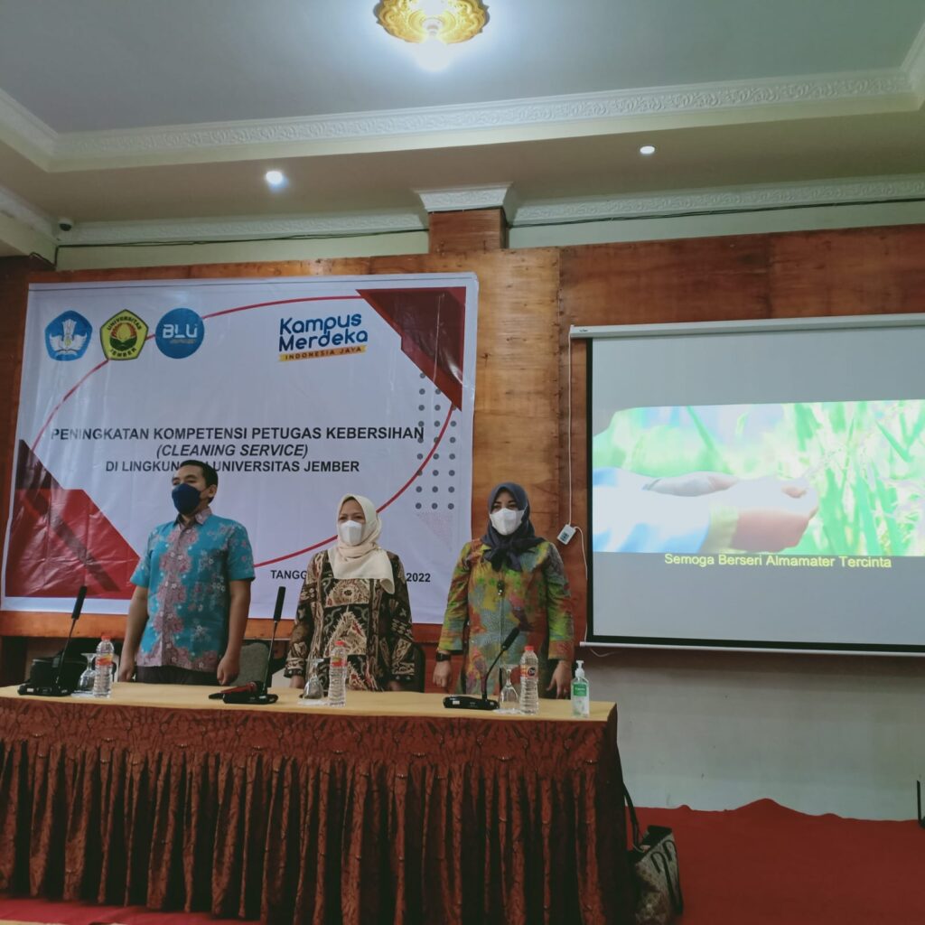 Universitas Jember memiliki Petugas cleaning service yang dipekerjakan untuk menunjang pelaksanaan kebersihan. Petugas cleaning service memerlukan peningkatan kompetensi berkenaan dengan pelaksanaan tugasnya secara teori maupun praktek di lapangan serta kemampuan hardskill dan softskill. Berdasarkan kebutuhan akan peningkatan kompetensi tersebut, maka Biro Umum, Kepegawaian, dan Keuangan dalam hal ini bagian kepegawaian sebagai bagian yang membidangi pengembangan sumberdaya manusia melaksanakan kegiatan peningkatan kompetensi petugas kebersihan. Materi yang akan diberikan pada kegiatan tersebut meliputi 5 basic cleaning (Dusting, Sweeping, Mopping, Glass & Toilet Cleaning), Non Teknis (Sikap/perilaku, Motivasi kerja, Inisiatif, 5S), Efisiensi Alat, Chemical, dan Deep Cleaning Kerak. Melihat dari materi yang akan disampaikan sehingga peningkatan pemahaman para petugas cleaning service secara luring menjadi sangat penting untuk segera dilaksanakan.